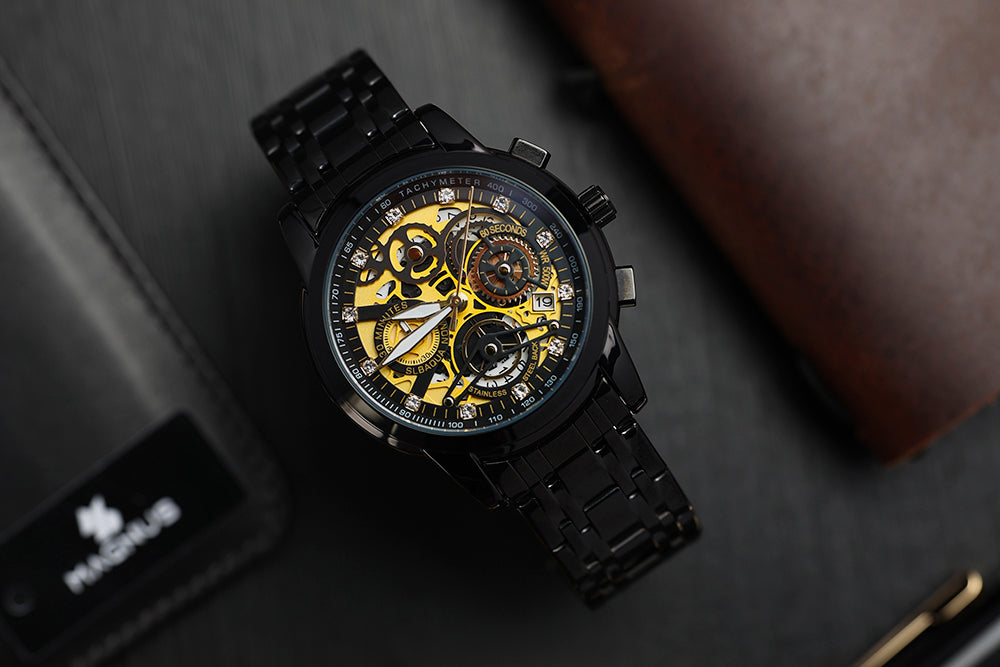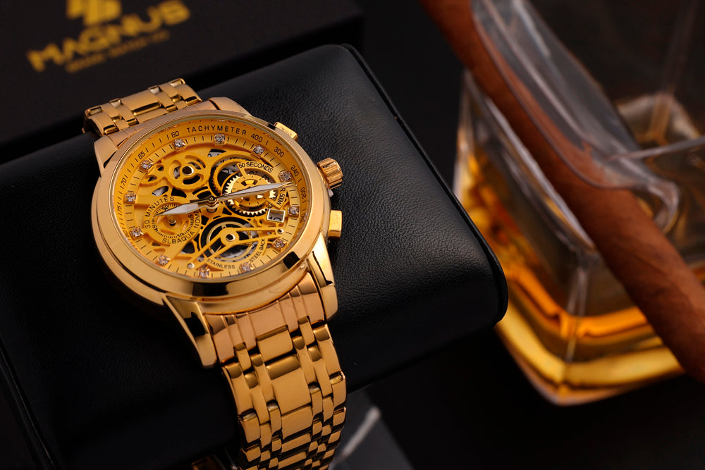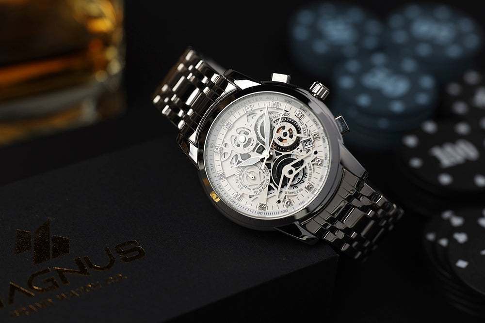 This very elegant Magnus Watch is made of the very best materials. The shiny case with flashy details, is made of stainless steel in a color of choice.